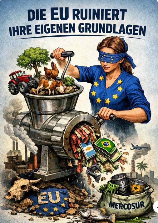 Nach 26 Jahren Verhandlung liefert die EU ihre Landwirtschaft, ihre Umweltstandards und ihre Ernährungssouveränität aus – für ein reales Wirtschaftswachstum nahe null. Während die Mercosur-Staaten Exportboom, Jobs und Wachstum kassieren, bleiben der EU Arbeitsplatzverluste, Standardabbau und Kapitalabfluss.